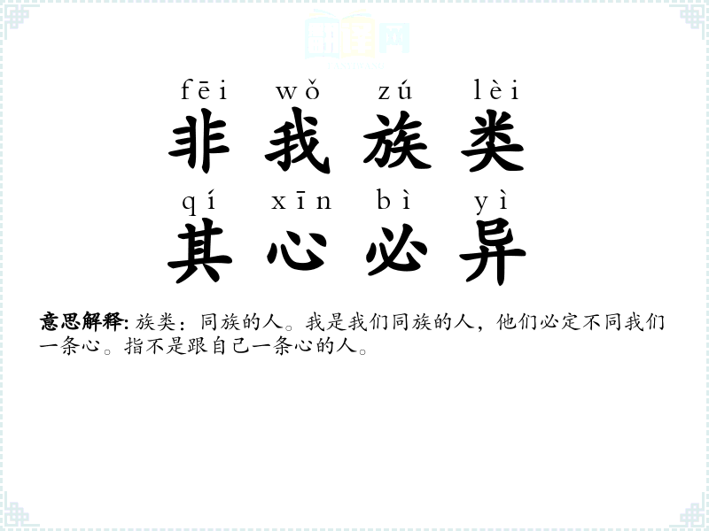 族类:同族的人。我是我们同族的人,他们必定不同我们一条心。指不是跟自己一条心的人。