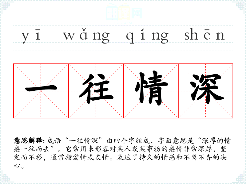成语“一往情深”由四个字组成,字面意思是“深厚的情感一往而去”。它常用来形容对某人或某事物的感情非常深厚,坚定而不移,通常指爱情或友情。表达了持久的情感和不离不弃的决心。
