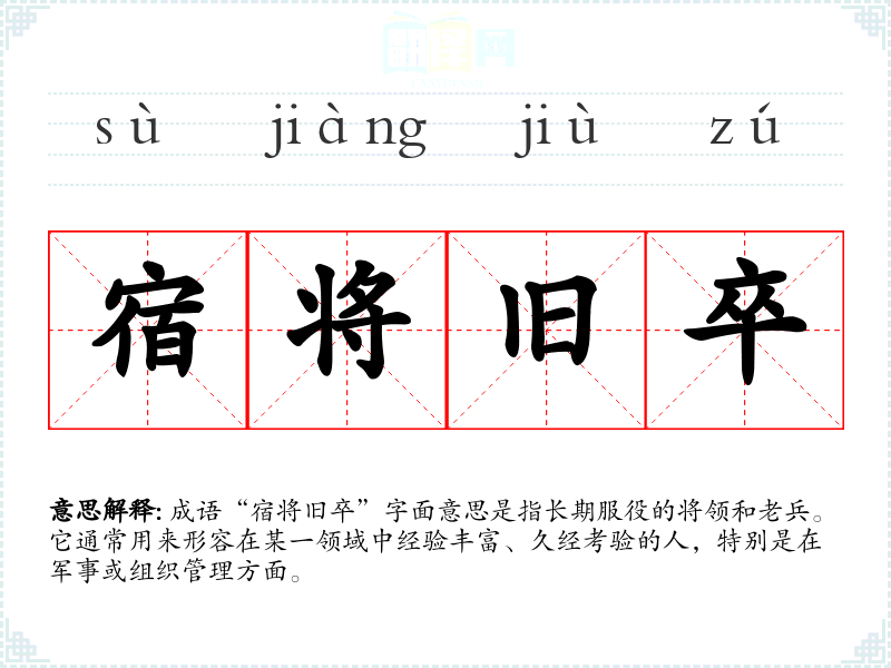 成语“宿将旧卒”字面意思是指长期服役的将领和老兵。它通常用来形容在某一领域中经验丰富、久经考验的人,特别是在军事或组织管理方面。