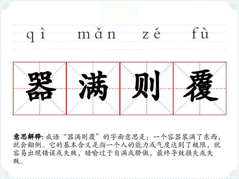 | 器满将覆 | 比喻事物发展超过一定界限就会向相反方面转化。亦以喻骄傲自满将导致失败。同“器满则覆”。 |