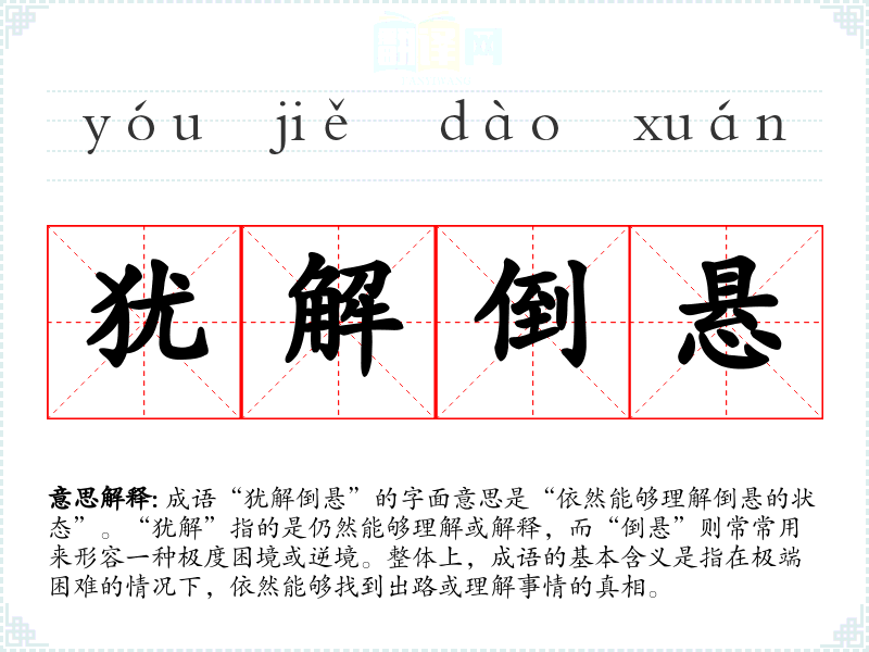 成语“犹解倒悬”的字面意思是“依然能够理解倒悬的状态”。“犹解”指的是仍然能够理解或解释,而“倒悬”则常常用来形容一种极度困境或逆境。整体上,成语的基本含义是指在极端困难的情况下,依然能够找到出路或理解事情的真相。