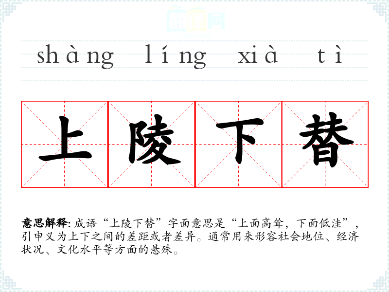 成语“上陵下替”字面意思是“上面高耸,下面低洼”,引申义为上下之间的差距或者差异。通常用来形容社会地位、经济状况、文化水平等方面的悬殊。