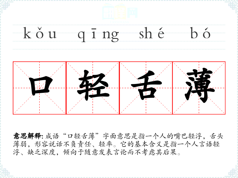 成语“口轻舌”字面意思是指一个人的嘴巴轻浮,舌头弱,形容说话不负责任、轻率。它的基本含义是指一个人言语轻浮、缺乏深度,倾向于随意发表言论而不考虑其后果。