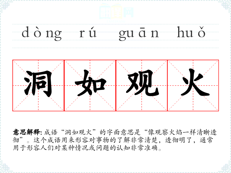 成语“洞如观火”的字面意思是“像观察火焰一样清晰透彻”。这个成语用来形容对事物的了解非常清楚,透彻明了,通常用于形容人们对某种情况或问题的认知非常准确。