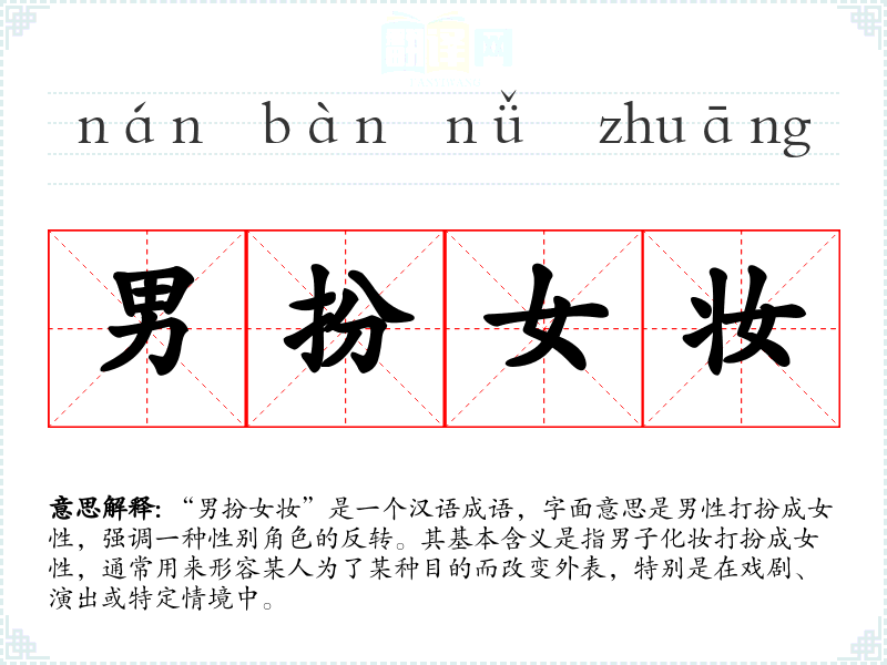 “男扮女妆”是一个汉语成语,字面意思是男性打扮成女性,强调一种性别角色的反转。其基本含义是指男子化妆打扮成女性,通常用来形容某人为了某种目的而改变外表,特别是在戏剧、演出或特定情境中。