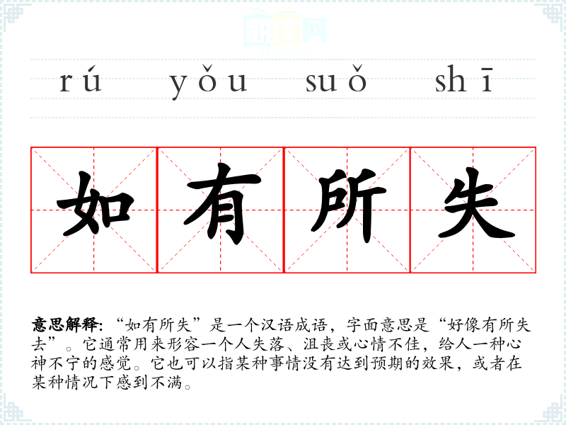 在英语中,与“如有所失”相似的表达可能是“feeling lost”,它也表达了一种迷茫和不安。然而,具体的文化背景和情感色彩可能不同,汉语中的成语往往更加精炼富有诗意。