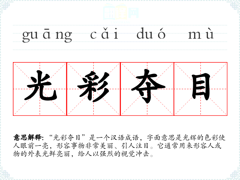 “光彩夺目”是一个汉语成语,字面意思是光辉的色彩使人眼前一亮,形容事物非常美丽、引人注目。它通常用来形容人或物的外表光鲜亮丽,给人以强烈的视觉冲击。