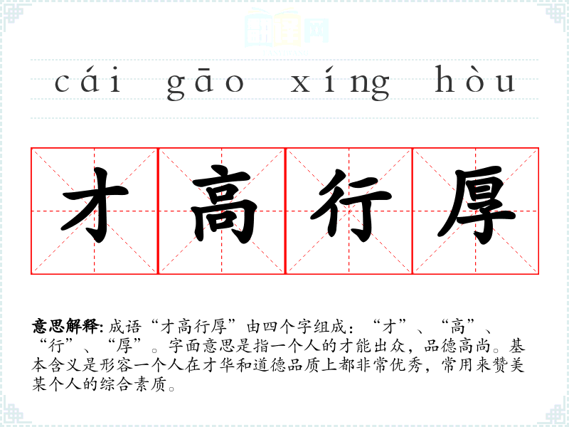 成语“才高行厚”由四个字组成:“才”、“高”、“行”、“厚”。字面意思是指一个人的才能出众,品德高尚。基本含义是形容一个人在才华和道德品质上都非常优秀,常用来赞美某个人的综合素质。