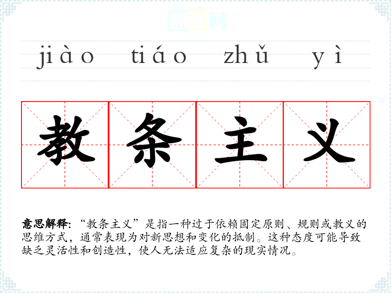 “教条主义”是指一种过于依赖固定原则、规则或教义的思维方式,通常表现为对新思想和变化的抵制。这种态度可能导致缺乏灵活性和创造性,使人无法适应复杂的现实情况。