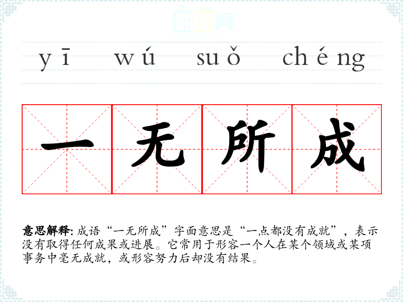成语“一无所成”字面意思是“一点都没有成就”,表示没有取得任何成果或进展。它常用于形容一个人在某个领域或某项事务中毫无成就,或形容努力后却没有结果。