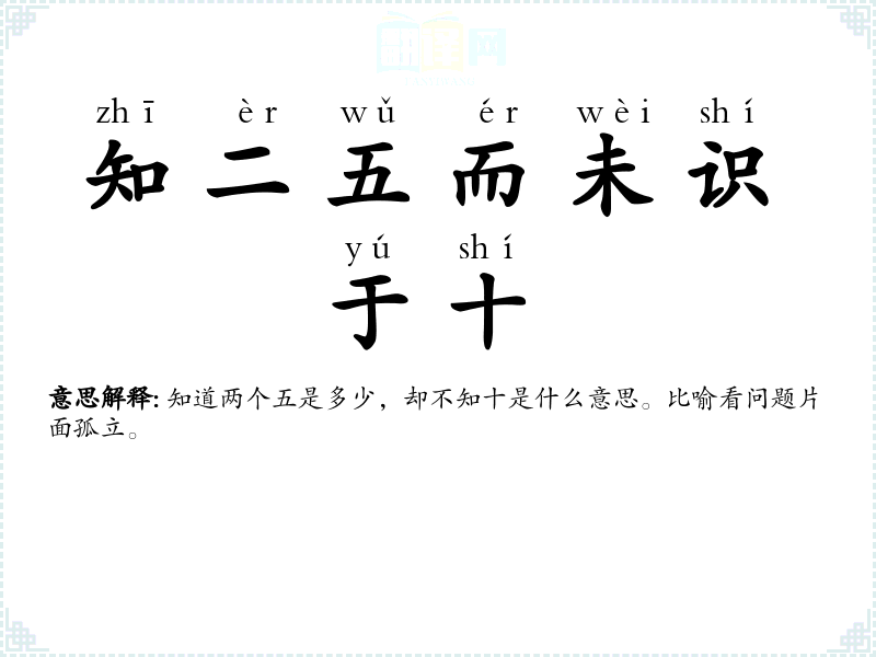 知道两个五是多少,却不知十是什么意思。比喻看问题片面孤立。 |