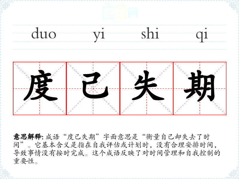 成语“度己失期”字面意思是“衡量自己却失去了时间”。它基本含义是指在自我评估或计划时,没有合理安排时间,导致事情没有按时完成。这个成语反映了对时间管理和自我控制的重要性。