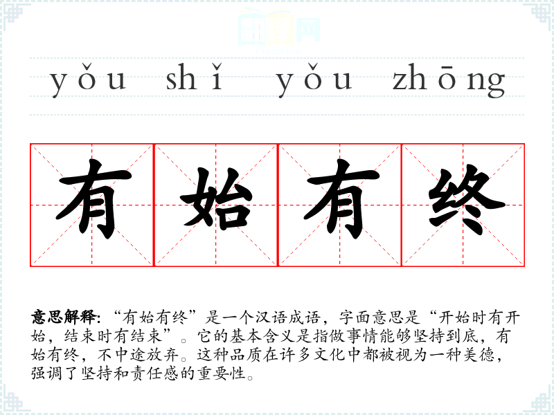 “有始有终”是一个汉语成语,字面意思是“开始时有开始,结束时有结束”。它的基本含义是指做事情能够坚持到底,有始有终,不中途放弃。这种品质在许多文化中都被视为一种美德,强调了坚持和责任感的重要性。
