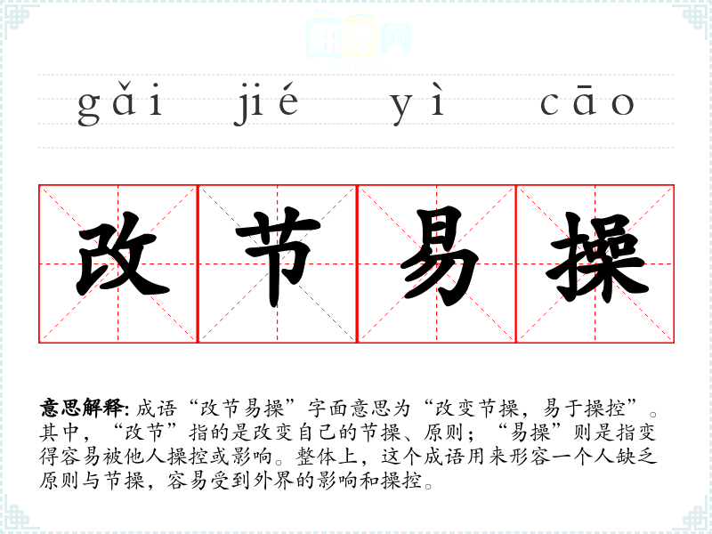 成语“改节易操”字面意思为“改变节操,易于操控”。其中,“改节”指的是改变自己的节操、原则;“易操”则是指变得容易被他人操控或影响。整体上,这个成语用来形容一个人缺乏原则与节操,容易受到外界的影响和操控。