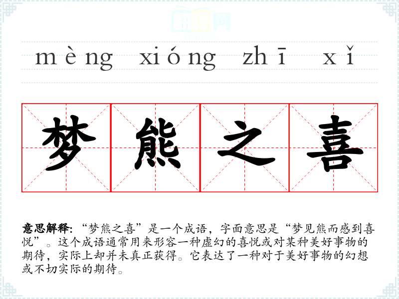 通过对“梦熊之喜”的学,我不仅理解了其字面和隐喻的意义,也认识到在生活中保持对现实的清醒与理想的追求之间的平衡。这一成语在我语言学和表达中提醒我要脚踏实地,更要对未来保持一种合理的期待与努力。