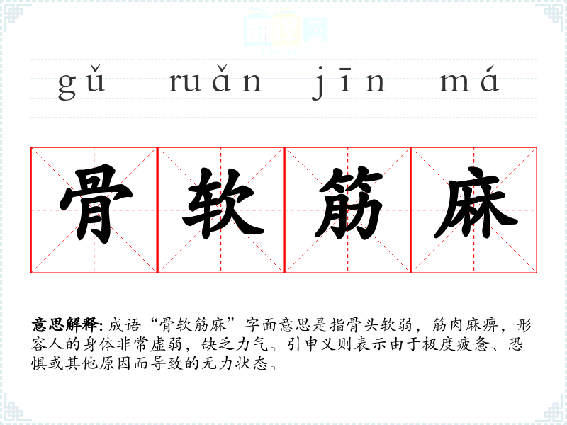 成语“骨软筋麻”字面意思是指骨头软弱,筋肉麻痹,形容人的身体非常虚弱,缺乏力气。引申义则表示由于极度疲惫、恐惧或其他原因而导致的无力状态。