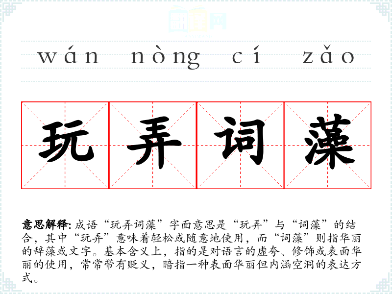 成语“玩弄词藻”字面意思是“玩弄”与“词藻”的结合,其中“玩弄”意味着轻松或随意地使用,而“词藻”则指华丽的辞藻或文字。基本含义上,指的是对语言的虚夸、修饰或表面华丽的使用,常常带有贬义,暗指一种表面华丽但内涵空洞的表达方式。