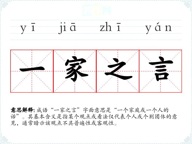 成语“一家之言”字面意思是“一个家庭或一个人的话”。其基本含义是指某个观点或看法仅代表个人或个别团体的意见,通常暗示该观点不具普遍性或客观性。