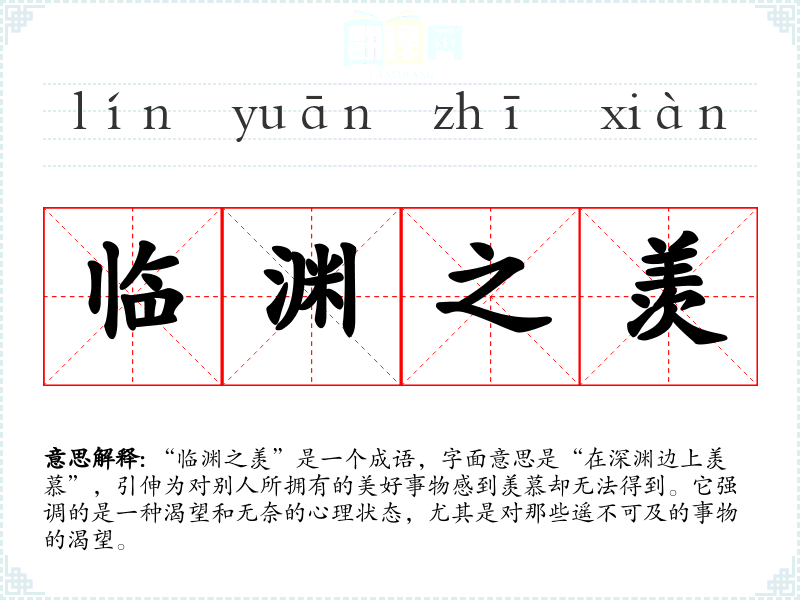 “临渊之羡”是一个成语,字面意思是“在深渊边上羡慕”,引伸为对别人所拥有的美好事物感到羡慕却无法得到。它强调的是一种渴望和无奈的心理状态,尤其是对那些遥不可及的事物的渴望。