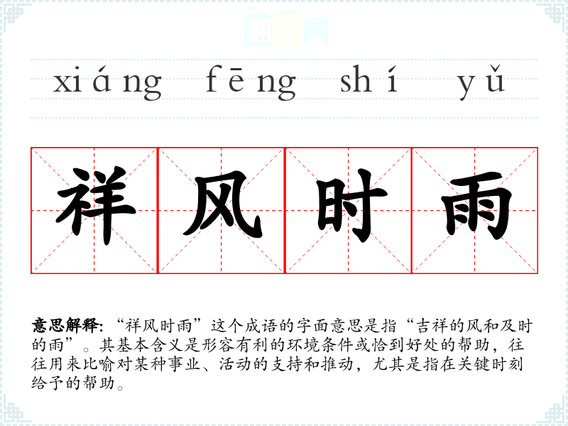 “祥风时雨”这个成语的字面意思是指“吉祥的风和及时的雨”。其基本含义是形容有利的环境条件或恰到好处的帮助,往往用来比喻对某种事业、活动的支持和推动,尤其是指在关键时刻给予的帮助。