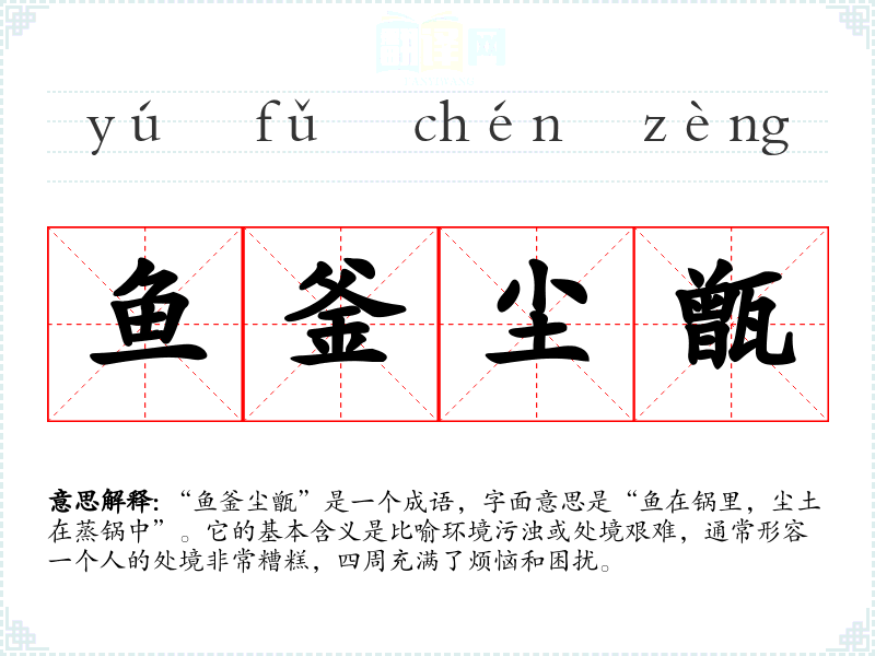 “鱼釜尘甑”是一个成语,字面意思是“鱼在锅里,尘土在蒸锅中”。它的基本含义是比喻环境污浊或处境艰难,通常形容一个人的处境非常糟糕,四周充满了烦恼和困扰。