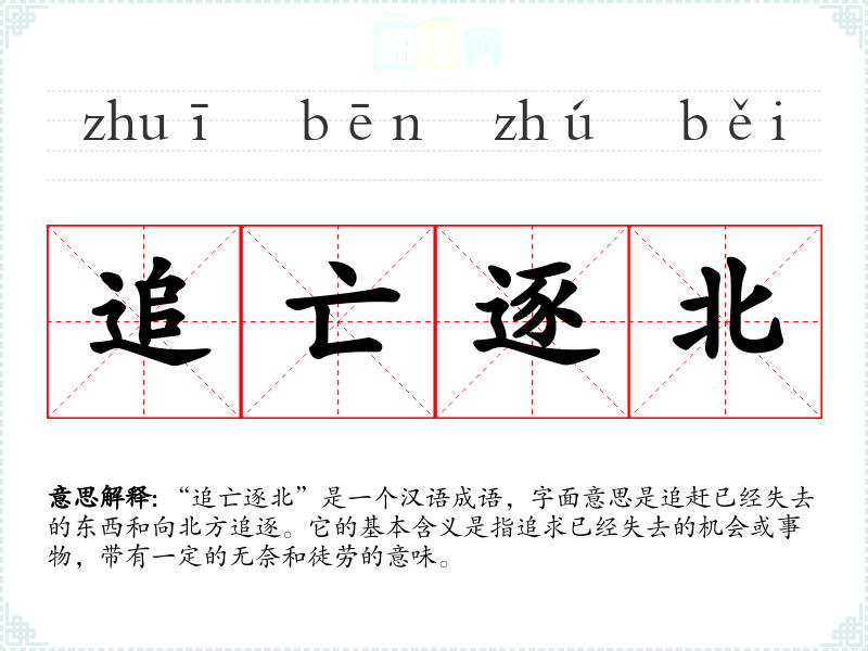 “追亡逐北”是一个汉语成语,字面意思是追赶已经失去的东西和向北方追逐。它的基本含义是指追求已经失去的机会或事物,带有一定的无奈和徒劳的意味。