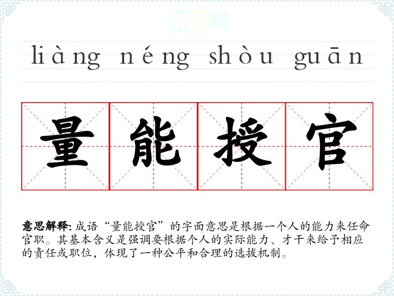成语“量能授官”的字面意思是根据一个人的能力来任命官职。其基本含义是强调要根据个人的实际能力、才干来给予相应的责任或职位,体现了一种公平和合理的选拔机制。