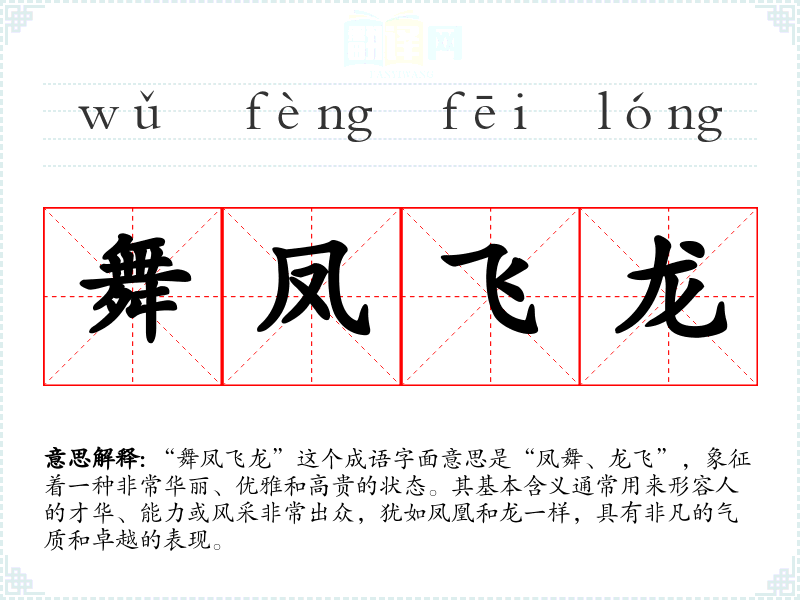 “舞凤飞龙”这个成语字面意思是“凤舞、龙飞”,象征着一种非常华丽、优雅和高贵的状态。其基本含义通常用来形容人的才华、能力或风采非常出众,犹如凤凰和龙一样,具有非凡的气质和卓越的表现。