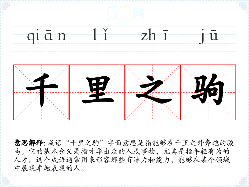 成语“千里之驹”字面意思是指能够在千里之外奔跑的骏马。它的基本含义是指才华出众的人或事物,尤其是指年轻有为的人才。这个成语通常用来形容那些有潜力和能力,能够在某个领域中展现卓越表现的人。