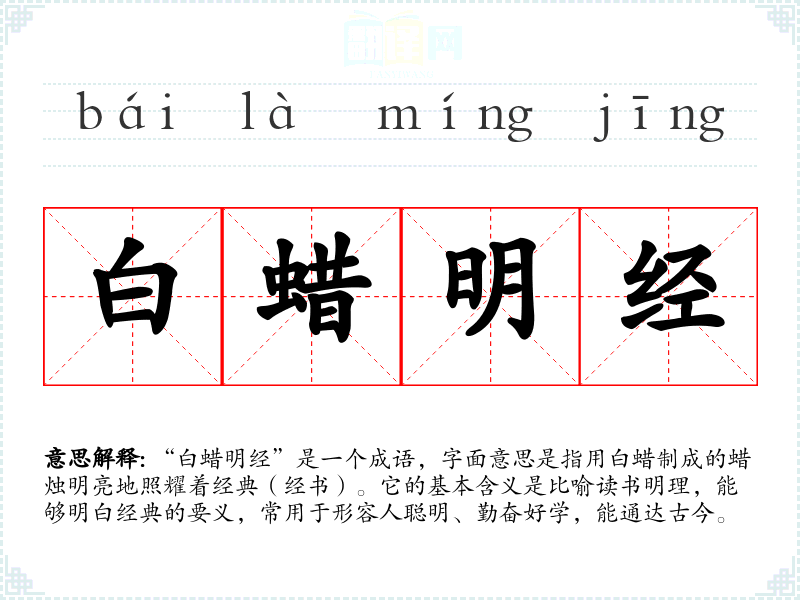 “白蜡明经”是一个成语,字面意思是指用白蜡制成的蜡烛明亮地照耀着经典(经书)。它的基本含义是比喻读书明理,能够明白经典的要义,常用于形容人聪明、勤奋好学,能通达古今。