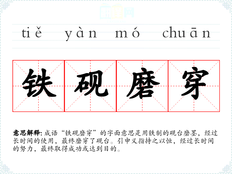成语“铁砚磨穿”的字面意思是用铁制的砚台磨墨,经过长时间的使用,最终磨穿了砚台。引申义指持之以恒,经过长时间的努力,最终取得成功或达到目的。