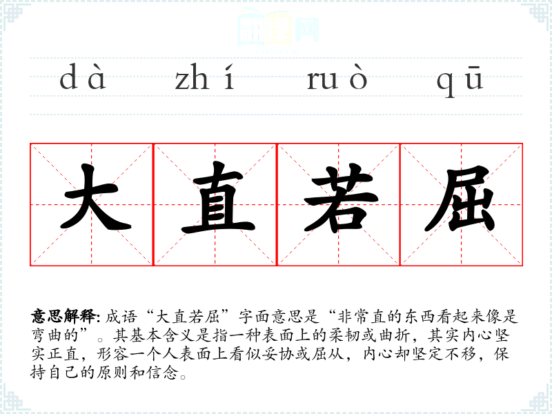 成语“大直若屈”字面意思是“非常直的东西看起来像是弯曲的”。其基本含义是指一种表面上的柔韧或曲折,其实内心坚实正直,形容一个人表面上看似妥协或屈从,内心却坚定不移,保持自己的原则和信念。