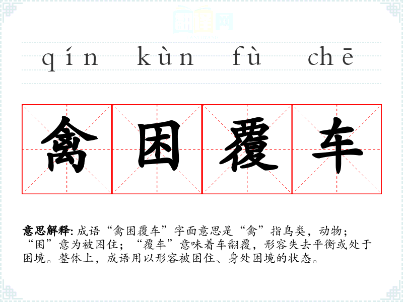 成语“禽困覆车”字面意思是“禽”指鸟类,动物;“困”意为被困住;“覆车”意味着车翻覆,形容失去平衡或处于困境。整体上,成语用以形容被困住、身处困境的状态。