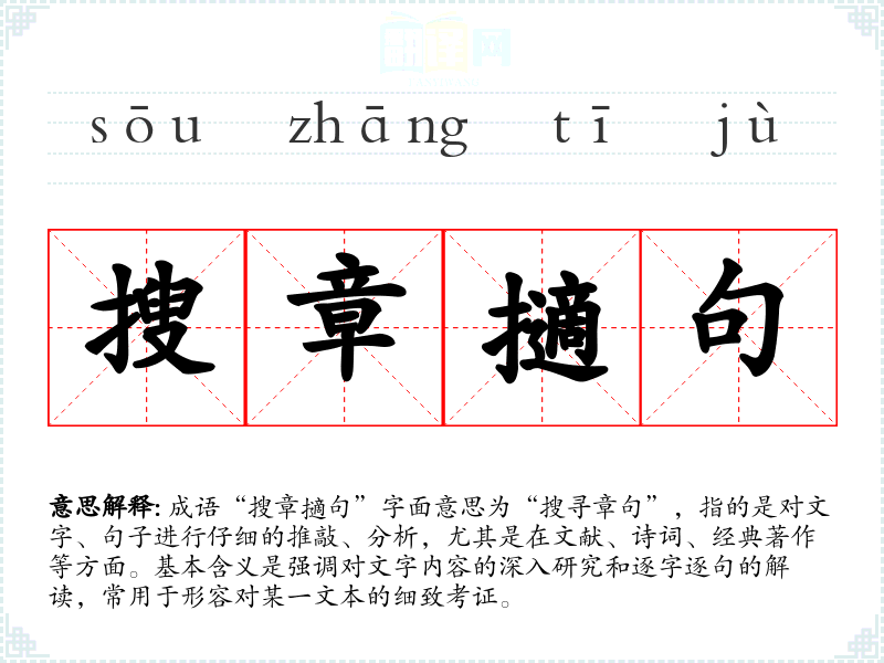 成语“搜章擿句”字面意思为“搜寻章句”,指的是对文字、句子进行仔细的推敲、分析,尤其是在文献、诗词、经典著作等方面。基本含义是强调对文字内容的深入研究和逐字逐句的解读,常用于形容对某一文本的细致考证。