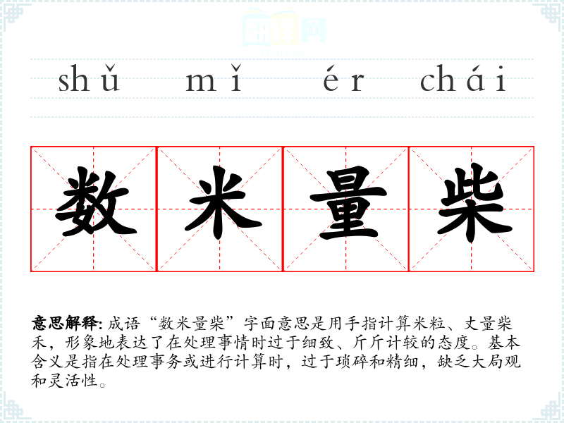 成语“数米量柴”字面意思是用手指计算米粒、丈量柴禾,形象地表达了在处理事情时过于细致、斤斤计较的态度。基本含义是指在处理事务或进行计算时,过于琐碎和精细,缺乏大局观和灵活性。