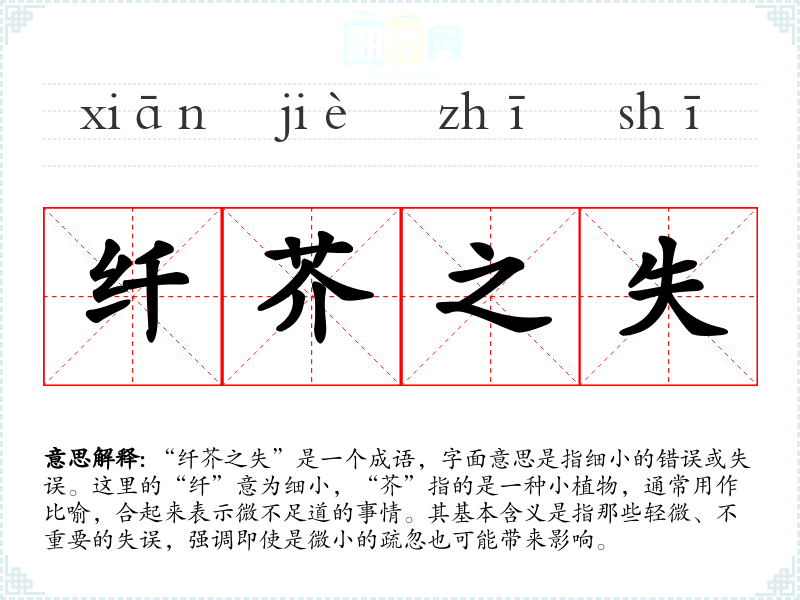 “纤芥之失”是一个成语,字面意思是指细小的错误或失误。这里的“纤”意为细小,“芥”指的是一种小植物,通常用作比喻,合起来表示微不足道的事情。其基本含义是指那些轻微、不重要的失误,强调即使是微小的疏忽也可能带来影响。