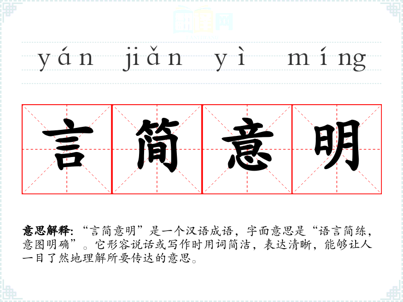 “言简意明”是一个汉语成语,字面意思是“语言简练,意图明确”。它形容说话或写作时用词简洁,表达清晰,能够让人一目了然地理解所要传达的意思。