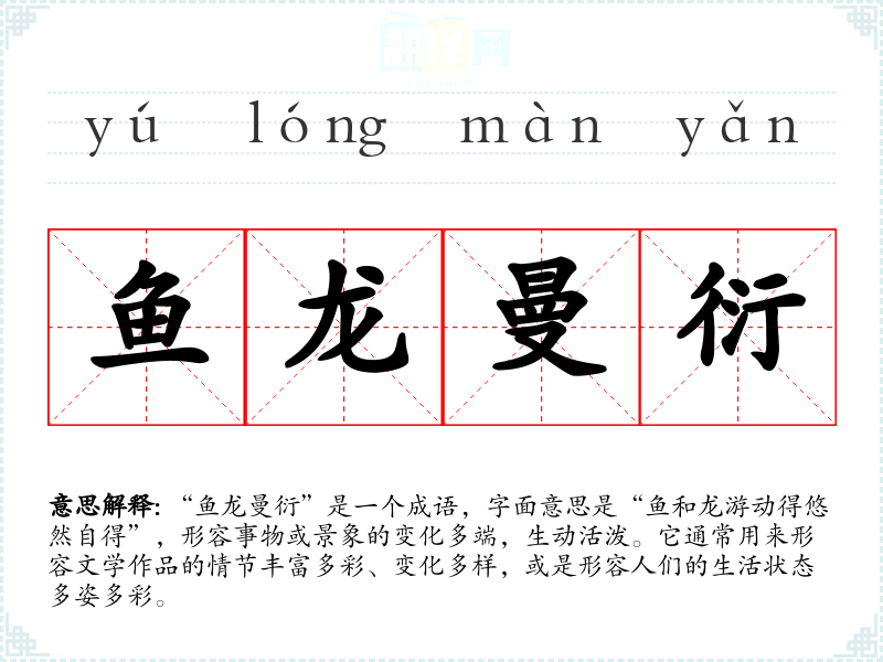 “鱼龙曼衍”是一个成语,字面意思是“鱼和龙游动得悠然自得”,形容事物或景象的变化多端,生动活泼。它通常用来形容文学作品的情节丰富多彩、变化多样,或是形容人们的生活状态多姿多彩。