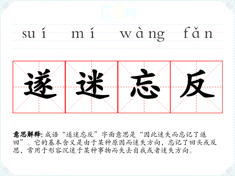 成语“遂迷忘反”字面意思是“因此迷失而忘记了返回”。它的基本含义是由于某种原因而迷失方向,忘记了回头或反思,常用于形容沉迷于某种事物而失去自我或者迷失方向。