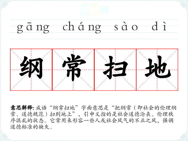 成语“纲常扫地”字面意思是“把纲常(即社会的伦理纲常、道德规范)扫到地上”,引申义指的是社会道德沦丧、伦理秩序混乱的状态。它常用来形容一些人或社会风气的不正之风,强调道德标准的缺失。