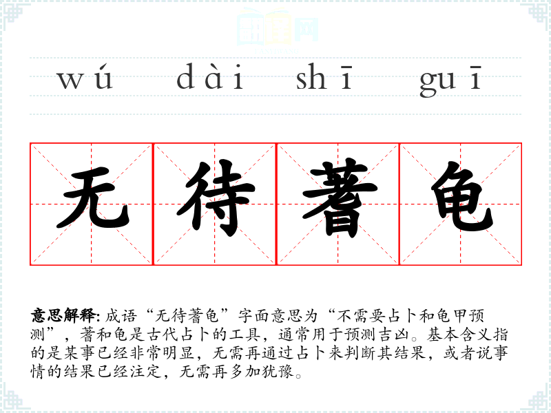 成语“无待蓍龟”字面意思为“不需要占卜和龟甲预测”,蓍和龟是古代占卜的工具,通常用于预测吉凶。基本含义指的是某事已经非常明显,无需再通过占卜来判断其结果,或者说事情的结果已经注定,无需再多加犹豫。