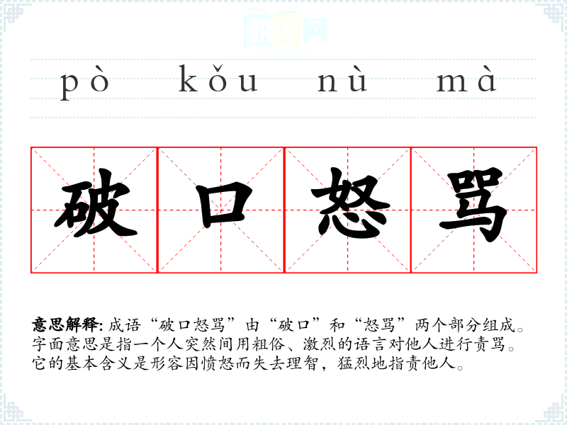 成语“破口怒骂”由“破口”和“怒骂”两个部分组成。字面意思是指一个人突然间用粗俗、激烈的语言对他人进行责骂。它的基本含义是形容因愤怒而失去理智,猛烈地指责他人。
