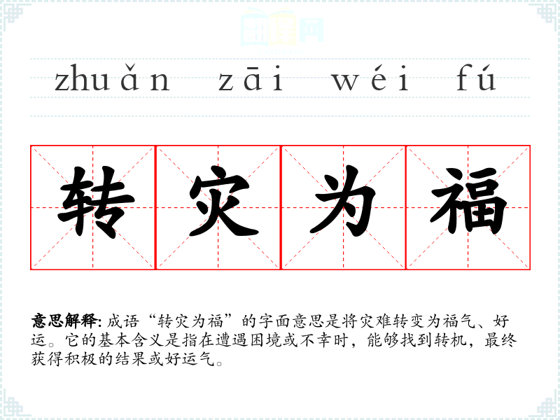 成语“转灾为福”的字面意思是将灾难转变为福气、好运。它的基本含义是指在遭遇困境或不幸时,能够找到转机,最终获得积极的结果或好运气。