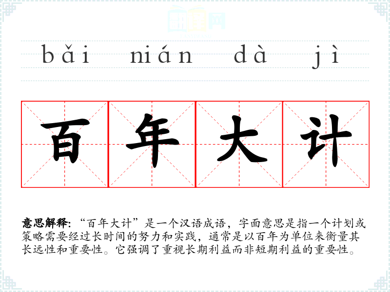 “百年大计”是一个汉语成语,字面意思是指一个计划或策略需要经过长时间的努力和实践,通常是以百年为单位来衡量其长远性和重要性。它强调了重视长期利益而非短期利益的重要性。