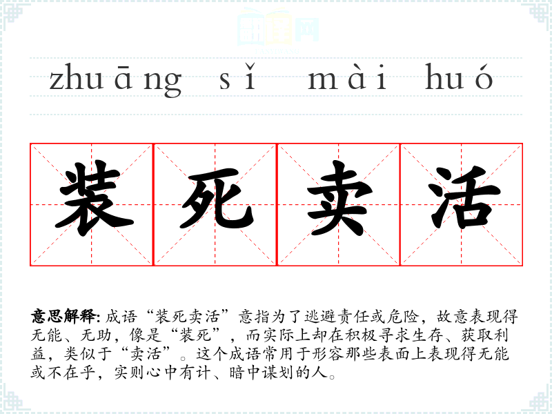 成语“装死卖活”意指为了逃避责任或危险,故意表现得无能、无助,像是“装死”,而实际上却在积极寻求生存、获取利益,类似于“卖活”。这个成语常用于形容那些表面上表现得无能或不在乎,实则心中有计、暗中谋划的人。
