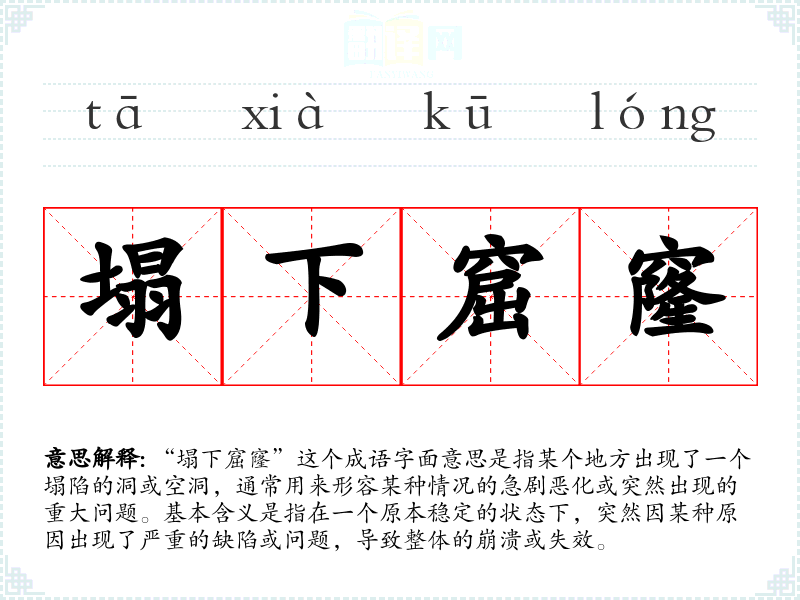 该成语的具体来源并不明确,但可以推测与古代建筑、居住环境等相关的实际情况有关。在古代,房屋的结构如果出现问题,塌陷的窟窿会直接影响到居住的安全性。因此,“塌下窟窿”这一表述可能是借用实际生活中的现象,来形容事物的突然变坏。