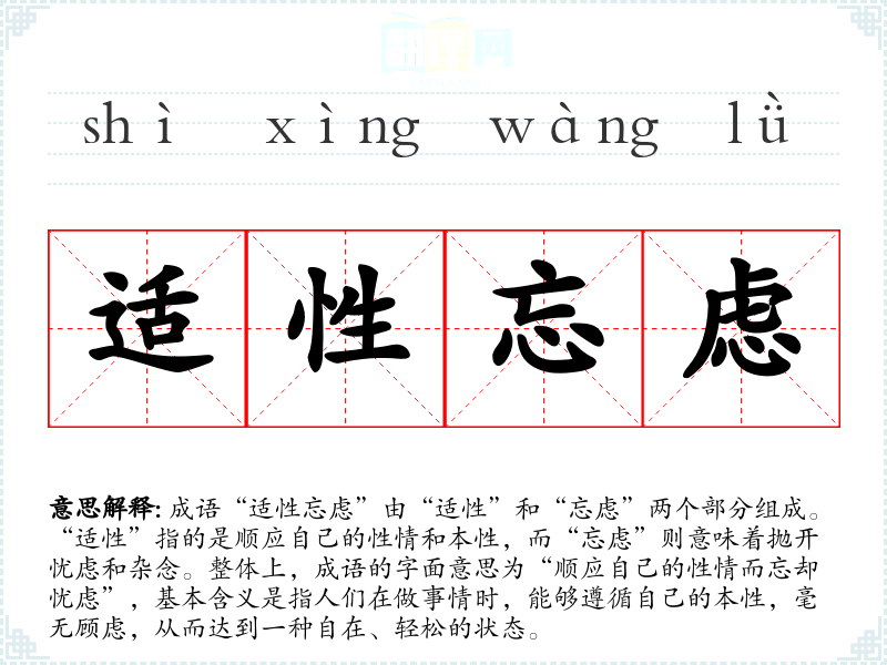成语“适性忘虑”由“适性”和“忘虑”两个部分组成。“适性”指的是顺应自己的性情和本性,而“忘虑”则意味着抛开忧虑和杂念。整体上,成语的字面意思为“顺应自己的性情而忘却忧虑”,基本含义是指人们在做事情时,能够遵循自己的本性,毫无顾虑,从而达到一种自在、轻松的状态。