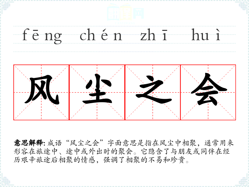 “风尘之会”出自于古代文人对旅途的描绘,最早可以追溯到一些古典文学作品中,表达了在漫长旅程中所产生的友情与情谊。它反映了古代人们对于友情的重视,尤其是在艰苦的环境中,友情显得尤为珍贵。