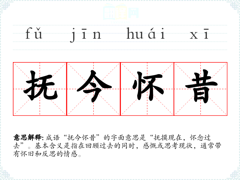 成语“抚今怀昔”的字面意思是“抚摸现在,怀念过去”。基本含义是指在回顾过去的同时,感慨或思考现状,通常带有怀旧和反思的情感。