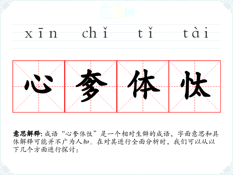 成语“心奓体忲”是一个相对生僻的成语,字面意思和具体解释可能并不广为人知。在对其进行全面分析时,我们可以从以下几个方面进行探讨: